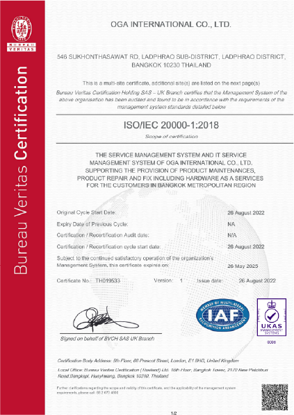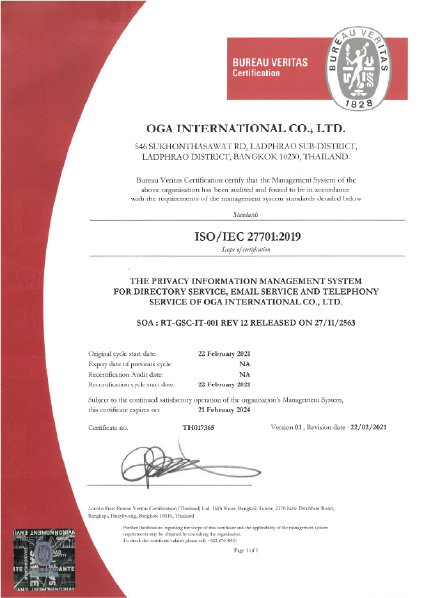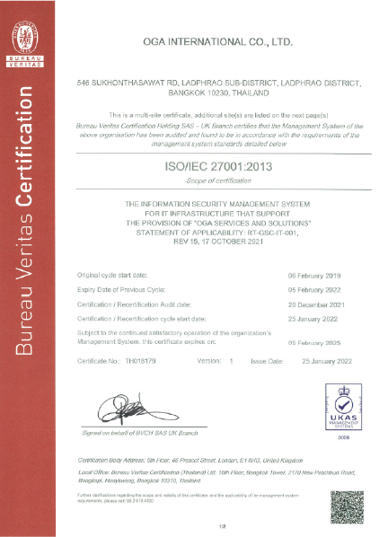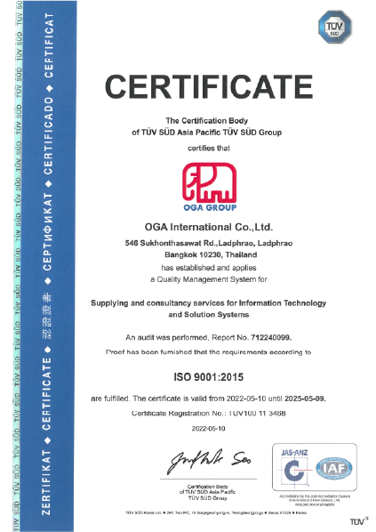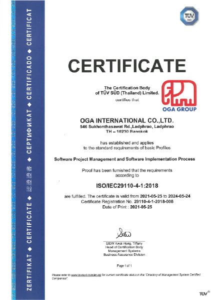 OGA ผ่านการการันตีคุณภาพมาตรฐานสากล ด้วย Certificate และ ISO มากมาย ทั้ง ISO 9001, ISO 20000, ISO 27001, ISO 27701, ISO 29110
