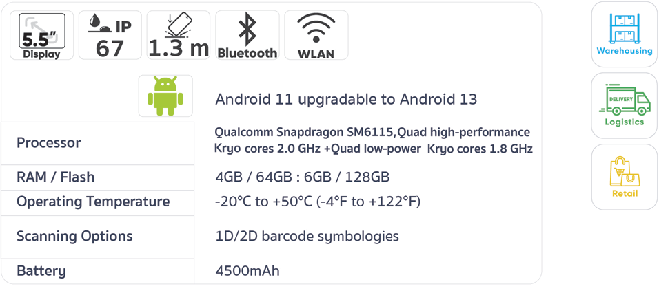 5G Connectivity The ScanPal EDA57 mobile computer features the latest Qualcomm® Snapdragon™ 2.2 GHz octa-core processor with wireless connectivity via NFC, Wi-Fi 5, Bluetooth® 5.1, and 5G network communications. With seamless 5G connectivity, the ScanPalEDA57 provides reliable, ultra-low-latency wireless connectivity between the device and the backend network. The ScanPalEDA57’s premium performance keeps your investment moving forward, preparing you for smart logistics, immersive commerce, flexible manufacturing, and collaborative workspaces.