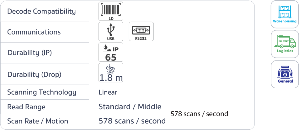 ซีรีส์ CipherLab 2500 ถูกออกแบบมาเพื่อการใช้งานที่รวดเร็วและง่ายดาย เช่น การรับสินค้า การจัดส่ง การตรวจสอบสินค้าคงคลัง งานระหว่างดำเนินการ และที่จุดขาย มันมาพร้อมกับอัตราการอ่านที่รวดเร็วถึง 578 สแกนต่อนาที สำหรับบาร์โค้ดแบบ 1D และยังสามารถจัดการกับบาร์โค้ดขนาดเล็กหรือบาร์โค้ดที่พิมพ์ไม่ชัดเจนได้อีกด้วย ทั้งยังรับประกันประสิทธิภาพด้วยการอ่านบาร์โค้ด 1D ขนาด 3 มิลลิเมตร ที่มีความหนาแน่นสูงและบาร์โค้ด 2D ขนาด 5 มิลลิเมตร ด้วยการผสมผสานประสิทธิภาพการสแกนที่เหนือกว่าเข้ากับการป้องกันระดับ IP65 และความทนทานต่อการตกจากความสูง 1.8 เมตร ทำให้เหมาะสำหรับทุกสภาพแวดล้อม ทั้งในคลังสินค้าและในไลน์การผลิต นอกจากนี้ยังมีฟีเจอร์ที่เป็นมิตรกับผู้ใช้ เช่น การตรวจจับอินเทอร์เฟซโดยอัตโนมัติ การป้องกันการปล่อยประจุไฟฟ้าสถิต (ESD) ที่เพิ่มขึ้น และแบตเตอรี่ที่สามารถเปลี่ยนได้ ทำให้มันกลายเป็นตัวเลือกที่เหมาะสมในการพัฒนาธุรกิจของคุณให้ทันสมัยยิ่งขึ้น
