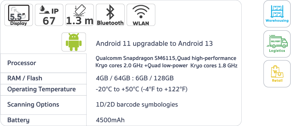 การเชื่อมต่อ 5G คอมพิวเตอร์พกพา ScanPal EDA57 นําเสนอ Qualcomm® Snapdragon™ รุ่นล่าสุด โปรเซสเซอร์ octa-core 2.2 GHz พร้อมการเชื่อมต่อไร้สายผ่าน การสื่อสารเครือข่าย NFC, Wi-Fi 5, Bluetooth® 5.1และ 5G ด้วยการเชื่อมต่อ 5G ที่ราบรื่น ScanPalEDA57 ให้ความน่าเชื่อถือและการเชื่อมต่อไร้สายที่มีความหน่วงต่ำเป็นพิเศษระหว่าง อุปกรณ์และเครือข่ายแบ็กเอนด์ ประสิทธิภาพระดับพรีเมียมของอุปกรณ์ ScanPalEDA57 ทําให้การลงทุนของคุณก้าวไปข้างหน้าด้วยการเต รียมพร้อมสําหรับโลจิสติกส์อัจฉริยะ การค้าที่สมจริง การผลิตที่ยืดหยุ่น และพื้นที่ทํางานร่วมกัน