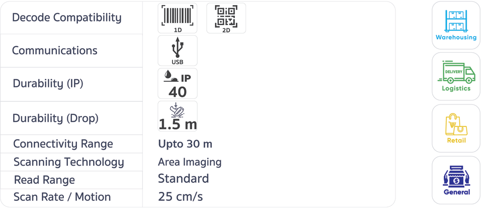 • สามารถสแกนบาร์โค้ดที่มีการชำรุดเสียหาย ไม่สมบูรณ์ หรือการพิมพ์คุณภาพต่ำได้อย่างแม่นยำ