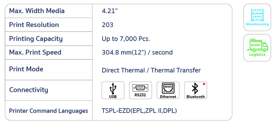 • ระบบการพิมพ์ : ใช้ความร้อนโดยตรง (Direct Thermal) และ ใช้ความร้อนผ่านผ้าหมึก (Thermal Transfer)